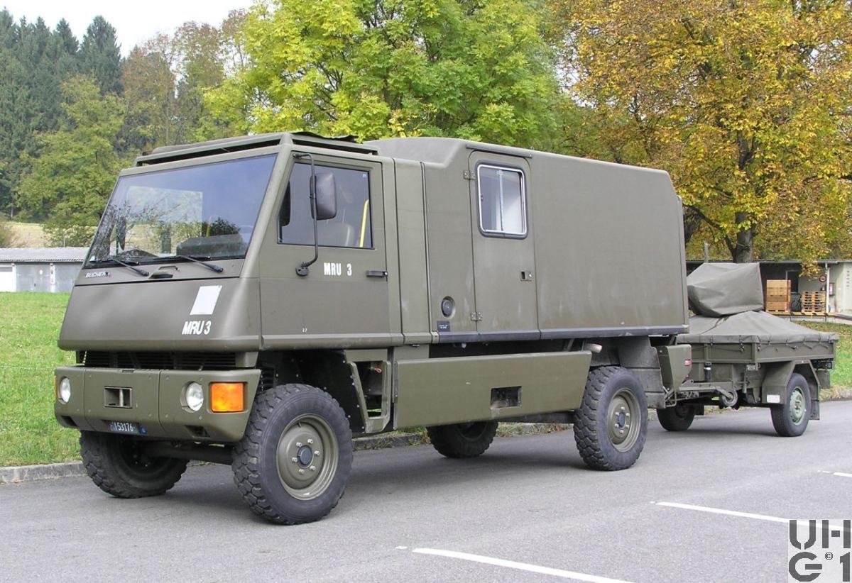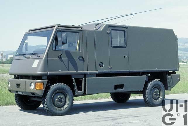 | Getriebe | Hauptgetriebe Mercedes Benz Typ W 4 A 028 4 Gang Automat hydraulisch gesteuert 4 Vorwärtsgänge 1 Rückwärtsgang Übersetzung 1. Gang 3,871:1 2. Gang 2,247:1 3. Gang 1,436:1 4. Gang 1,000:1 R-Gang 5,586:1 Verteilergetriebe Bucher Typ V-2GS-TD 15 Synchronisiertes 2- Stufen Verteilergetriebe mit Torsen Längsdifferential 1 Stufe Strassenstufe 1 Stufe Berg- / Geländestufe Übersetzung 0,71:1 Strassengang 1,42:1 Geländegang |