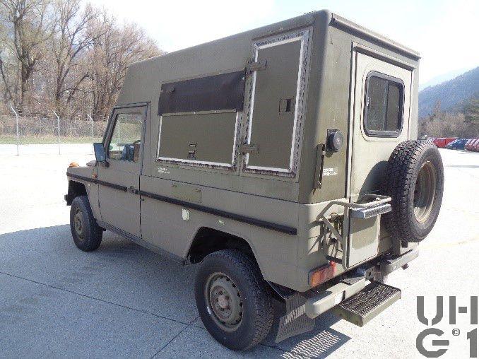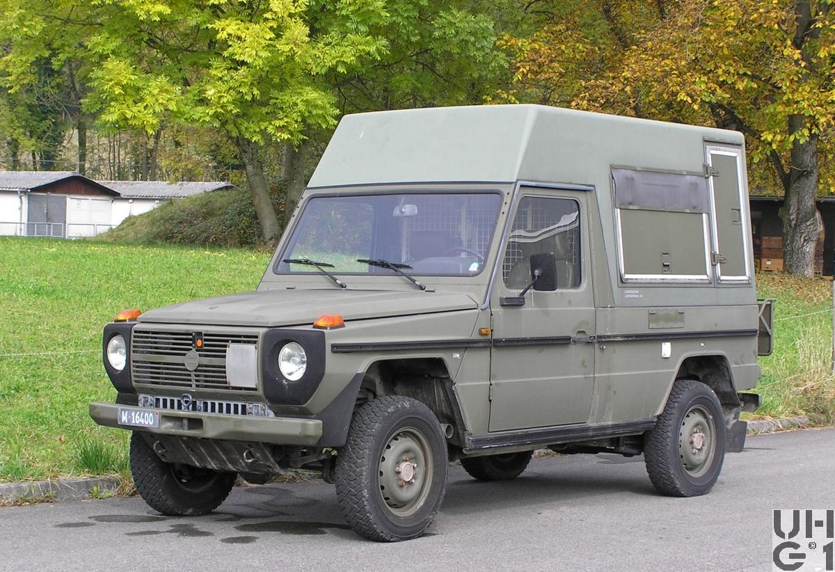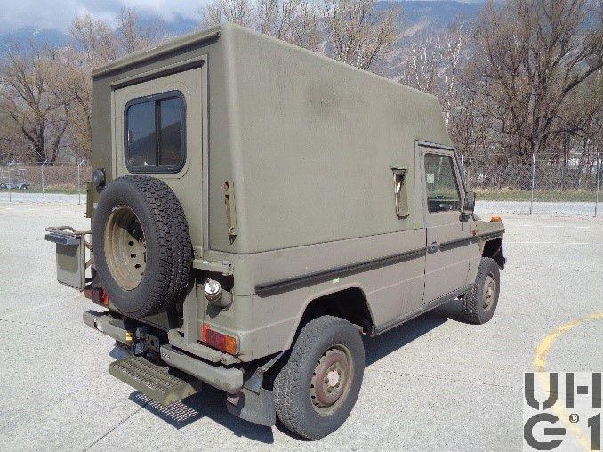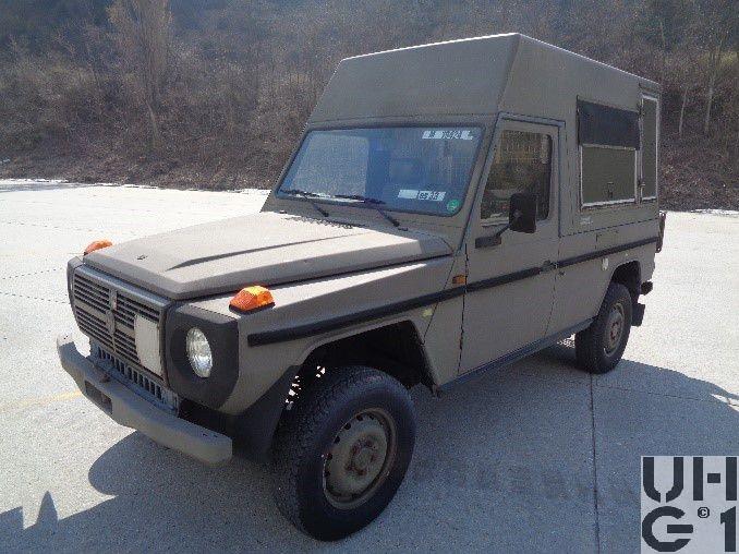 | Getriebe | Hauptgetriebe Hersteller Mercedes Benz Typ W 4 A 028 4 Vorwärtsgänge 1 Rückwärtsgang Vorderradantrieb während des fahrens zuschaltbar Geländeuntersetzung zuschaltbar Übersetzungen 1. Gang 4,007:1 2. Gang 2,392:1 3. Gang 1,463:1 4. Gang 1,000:1 R. Gang 5,495:1 Verteilergetriebe Hersteller Mercedes Benz Typ VG 080 Zweiwellen Verteilergetriebe mit synchronisiertem Geländegang Übersetzung 1,00:1 Strassengang 2,14:1 Geländegang Bedienung der Schaltung Die Schaltung sowohl der Geländeübersetzung als auch des Allradantriebes erfolgt mit einem zentralen Schalthebel "S" Strassengang, Hinterradantrieb "SA" Strassen-Allradantrieb, zusätzlich werden die Vorderräder angetrieben "GA" Geländeallradantrieb, zusätzlich zum Allradantrieb ist die Geländeübersetzung eingeschaltet Differentialsperre Schaltgriff neben dem Schalthebel nach oben ziehen, die Diff-Sperre der Hinterachse ist eingeschaltet |