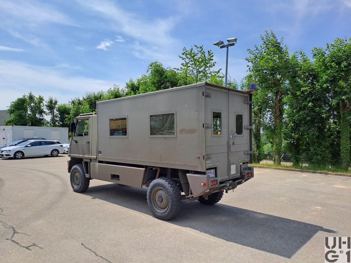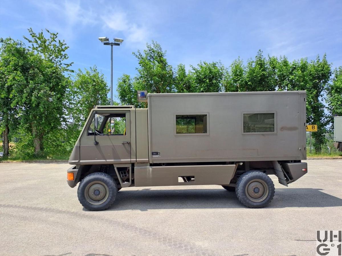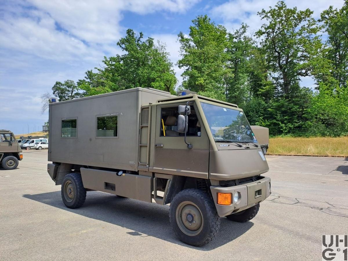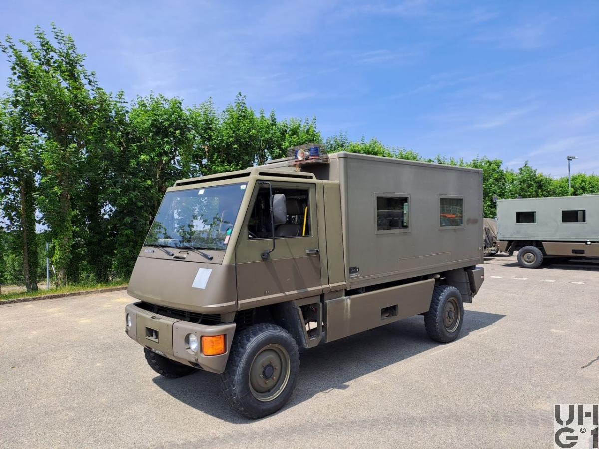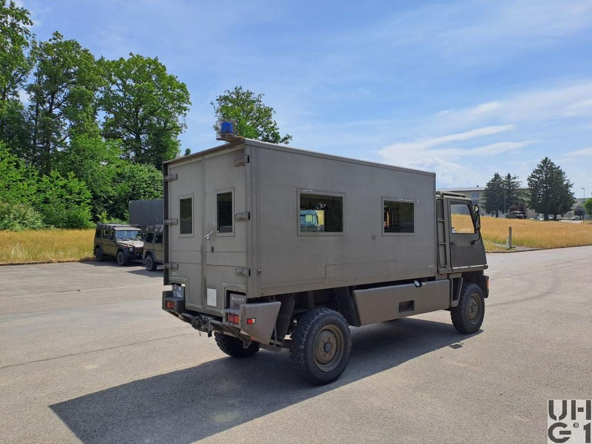 | Getriebe | Hauptgetriebe Mercedes Benz Typ W 4 A 028 4 Gang Automat hydraulisch gesteuert 4 Vorwärtsgänge 1 Rückwärtsgang Übersetzung 1. Gang 3,871:1 2. Gang 2,247:1 3. Gang 1,436:1 4. Gang 1,000:1 R-Gang 5,586:1 Verteilergetriebe Bucher Typ V-2GS-TD 15 Synchronisiertes 2- Stufen Verteilergetriebe mit Torsen Längsdifferential 1 Stufe Strassenstufe 1 Stufe Berg- / Geländestufe Übersetzung 0,71:1 Strassengang 1,42:1 Geländegang |