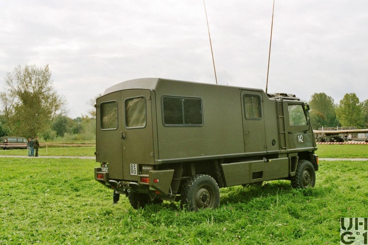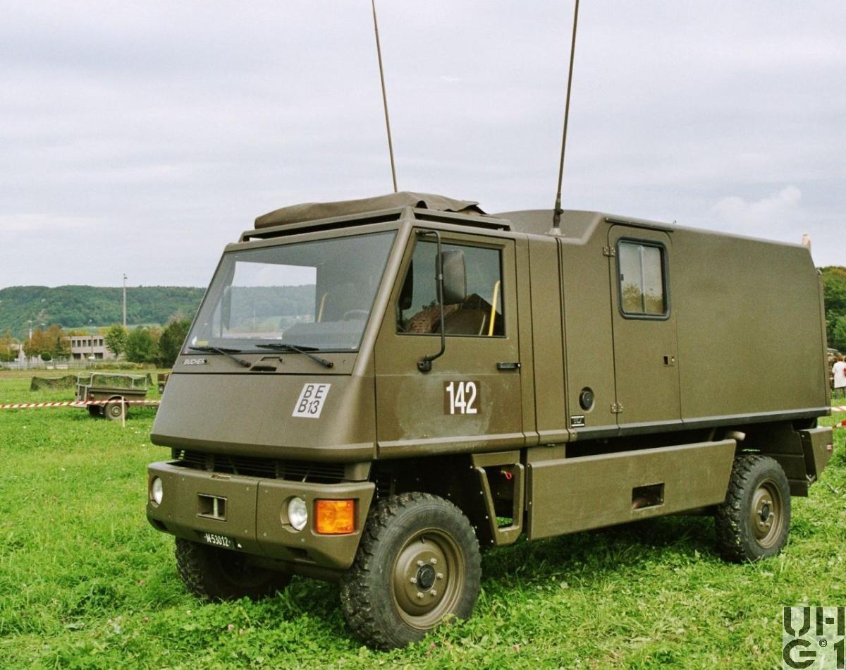 | Getriebe | Hauptgetriebe Mercedes Benz Typ W 4 A 028 4 Gang Automat hydraulisch gesteuert 4 Vorwärtsgänge 1 Rückwärtsgang Übersetzung 1. Gang 3,871:1 2. Gang 2,247:1 3. Gang 1,436:1 4. Gang 1,000:1 R-Gang 5,586:1 Verteilergetriebe Bucher Typ V-2GS-TD 15 Synchronisiertes 2- Stufen Verteilergetriebe mit Torsen Längsdifferential 1 Stufe Strassenstufe 1 Stufe Berg- / Geländestufe Übersetzung 0,71:1 Strassengang 1,42:1 Geländegang |
