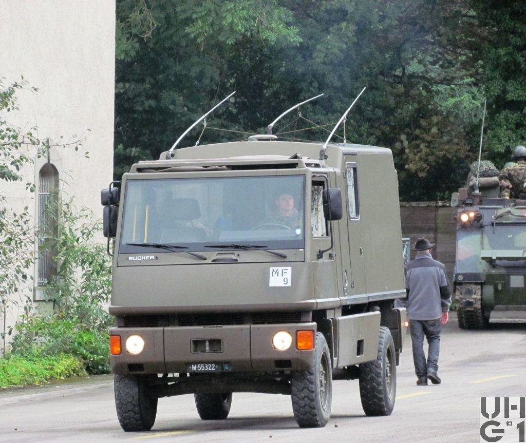 | Achsen | Vorne Hersteller Bucher Typ Bucher De Dion Lenkstarrachse in DE DION Bauweise mit langem achsfesten Längslenker und Wattgestänge Querführung durch Wattgestänge Längsführung mittels langem, an den Achsen festen Lenkern und über sphärische Gummilager mit dem Chassis verbunden Beidseitig an den Achsjochen angreifende Stabilisator Elemente System Bucher Achsgetriebe mit Bremsen im Chassis gelagert Antrieb über Kegelradgetriebe Torson Differential und Gleichlauf Gelenkwellen zu den Stirnrad Radantrieben Übersetzung 2,23:1 Achsgetriebe 4,07: Radantrieb Schraubenfeder und Gasdruckstossdämpfer zu Federbein zusammengefasst Cellasto Zusatzfedern Chromstahlseile zur Ausfederbegrenzung Felgen 9.00 - 20 Stahlrad mit Tiefbettfelgen Bereifung Michelin XZL 275/80 R 20 128 K Einfachbereifung Hinten Hersteller Bucher Typ Bucher De Dion Starrachse in DE DION Bauweise mit langem achsfesten Längslenker und Wattgestänge Querführung durch Wattgestänge Längsführung mittels langem, an den Achsen festen Lenkern und über sphärische Gummilager mit dem Chassis verbunden Beidseitig an den Achsjochen angreifende Stabilisator Elemente System Bucher Achsgetriebe mit Bremsen im Chassis gelagert Antrieb über Kegelradgetriebe Torson Differential und Gleichlauf Gelenkwellen zu den Stirnrad Radantrieben Übersetzung 2,23:1 Achsgetriebe 4,07:1 Radantrieb 2 Schraubenfedern Gasdruckstossdämpfer Cellasto Zusatzfedern Stabilisator Chromstahlseile zur Ausfederbegrenzung Felgen 9.00 - 20 Stahlrad mit Tiefbettfelgen Bereifung Michelin XZL 275/80 R 20 128 K Einfachbereifung |