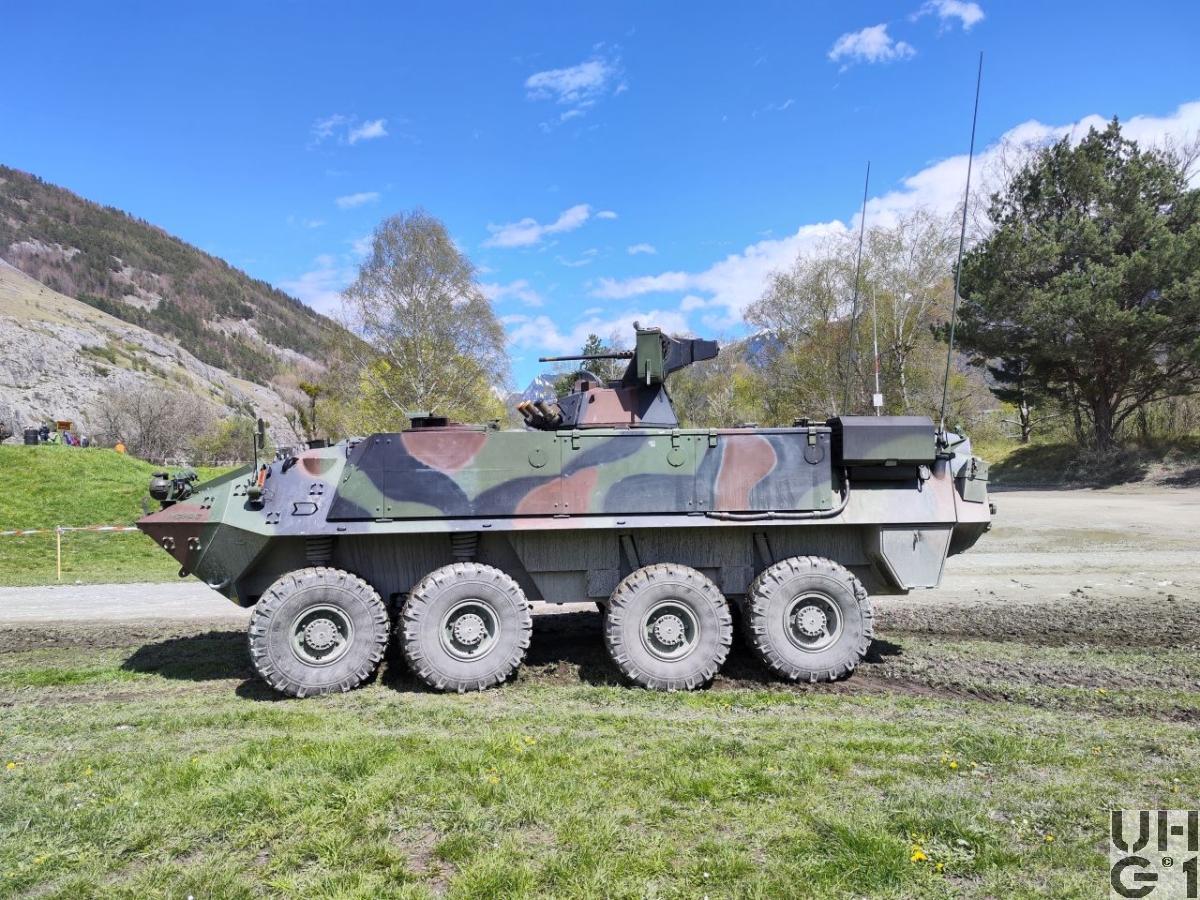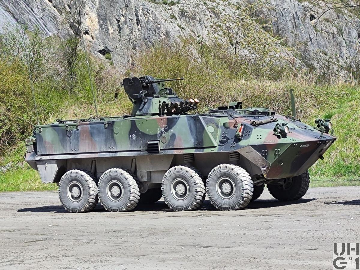 | Bemerkungen | Bewaffnung Ein-Mann-Scheitelturm Hersteller Fa. KUKA Deutschland Typ 606 A1-CH Die Bedienung des Waffenturms erfolgt manuell Die Waffe wird durch eine elektrische Abfeuereinrichtung und im Notbetrieb durch eine mechanische Abfeuereinrichtung ausgelöst Der Waffenturm trägt ein aussenliegendes 12,7 mm Mg 64/93, das über der Waffenturmmitte an einem Lagerständer höhenschwenkbar lafettiert ist. An der linken Seite des Lagerständers ist der Munitionskastenträger angeflanscht. Der Munitionskastenträger nimmt die Munitionskiste auf und schwenkt ebenfalls innerhalb des Höhenrichtbereichs der Waffe mit. Die Munitionszufuhr erfolgt über einen starren Zuführkanal durch den Lagerständer zur Waffe. 12,7 mm Maschinengewehr 1964/93 12,7 mm Mg 63/93 Hersteller Browning, Ramo, Maremont (USA), FN Herstal (B) Technische Daten 12,7 mm Kaliber 8 Anzahl Züge 450 - 650 Schuss / Minute Schusskadenz 890 m / Sekunde Anfangsgeschwindigkeit 3'560 kg/cm² Gasdruck 1'000 m Max. Einsatzdistanz 50° Max. Elevation 10° Max. Deoression 26 kg Gewicht ohne Lauf 12 kg Gewicht des Laufes Feuerarten Serien von 4 - 6 Schuss gegen weiche und harte Ziele Serien von 8 - 12 Schuss gegen Luftziele Das Maschinengewehr 64/93 ist eine automatische Waffe. Es ist mit einem luftgekühlten Rückstosslader mit Blockverschluss und Keilverriegelung ausgestattet. Kampfmunition 12,7 mm Mg 64 Pz Spr Pat 92 12,7 mm Mg 64 Pz Spr Pat 93 Lsp 12,7 mm Mg 64 Pz Spr Pat 92 und Pz Spr Pat 93 Lsp (3:1) 12,7 mm Mg 64 Pz Br Pat 64 und Pz Br Pat 65 Lsp 12,7 mm Mg 64 Pz Spr Pat 92+Pz Spz Pat 05 Lsp (3:1) 12,7 mm Mg 64 Spr Pat 92 12,7 mm Mg 64 Pz Spr Pat 92 Lsp Übungsmunition 12,7 mm Mg 64 UPat 76 + UPat 77 Lsp 12,7 mm Mg 64 UPat 77 Lsp (gegurtet) 12,7 mm Mg 64 UPat 04+UPat 05 Lsp (3:1) 12,7 mm Mg 64 UPat 04 (gegurtet) Manipuliermunition 12,7 mm Mg 64 Manip Pat Munitionsvorrat 1200 Schuss 6 Kisten zu 200 Schuss gegurtet 1 Kiste im Munitionskastenträger 2 Kisten vor dem Notsitz am Boden 3 Kisten auf dem Notsitz Nebelwerfer Radschützenpanzer 93 7,6 cm Nebelwurfanlage 87 Radspz 93 7,6 cm Nbwanl 1987 Hersteller W+F Bern Entwickler Diehl Deutschland Technische Daten 76 mm Kaliber 5 Sekunden Dauer Aufbau Nebelwand 90 - 200 Sekunden Dauer des Nebels 100 - 200 m Nebelwandbreite 50 - 90 m Wurfweite 8 Nebelwerfer Im Frontbereich des Waffenturmgehäuses Elektrische Auslösung am Bediengerät durch den Kommandanten Kampfmunition 7,6 cm Nb Pat 87 el Zü 7,6 cm Nb Pat 95 el Zü Übungsmunition 7,6 cm U Nb Pat 90 el Zü 7,6 cm U Nb Pat 97 el Zü Manipuliermunition 7,6 cm Manip Nb Pat 95 Munitionsvorrat 16 Schuss 8 Schuss geladen 8 Schuss Mannschaftsraum rechte Seite unter Sitzbank, vorderer Teil Zusätzliche Munition 4 Segeltuchtaschen mit Magazienen zu Stgw 90 (72 Magazine) 1 Blechkoffer 5,6 mm Gw Pat 90 8 PzF HL Pat in Halterung 4 Blechkoffer HG 85 12 Kunststoffbehälter à 2 Schuss 6 cm Werfer Munition 1 Richtladung schwer (Nur Zfr Rad Spz) 3 Richtladungen leicht 40 mm Granatgewehrmunition Übermittlungsmaterial 1 SE-235/m1 Funkanlage (Nur Gr Rad Spz) 1 SE-235/m2+ Funkanlage (Nur Zfr Rad Spz) 1 BVA-235 Bordverständigungsanlage 1 LV-235 Leistungsverstärker (Nur Gr Rad Spz) 1 LV-235+ Leistungsverstärker (Nur Zfr Rad Spz) 1 SE-235/m1 Sender-Empfänger (Nur Gr Rad Spz) 1 SE-235/m2 Sender-Empfänger (Nur Zfr Rad Spz) 1 SE-235/t Sender-Empfänger Tragbar 1 SV-235 Speiseverteiler 2 SE-LV HF-Kabel 1 CS-Box Zentrales Steuergerät 1 CC-Box Steuergerät Kommandant 3 C-Box Steuergeräte Mannschaft 2 RC-Box Fernsteuergerät und Aussenstation 2 LS-Box Lautsprecherbox 4 PSG-235 Pz-Sprechgarnituren 2 MT-235 Mikrotel 2 FzA-235 Fahrzeugantennen 2 F Tf 50 Feldtelefone |