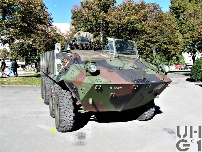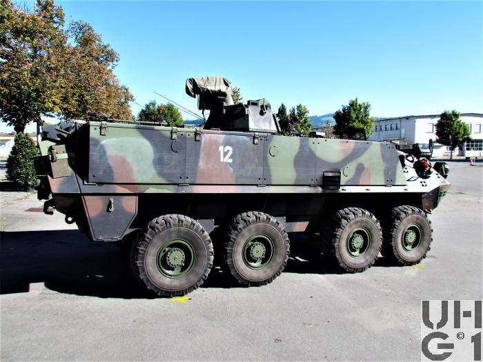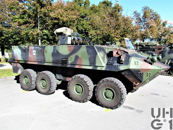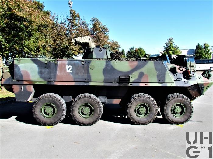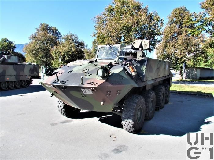 | Bemerkungen | Bewaffnung Ein-Mann-Scheitelturm Hersteller Fa. KUKA Deutschland Typ 606 A1-CH Die Bedienung des Waffenturms erfolgt manuell Die Waffe wird durch eine elektrische Abfeuereinrichtung und im Notbetrieb durch eine mechanische Abfeuereinrichtung ausgelöst Der Waffenturm trägt ein aussenliegendes 12,7 mm Mg 64/93, das über der Waffenturmmitte an einem Lagerständer höhenschwenkbar lafettiert ist. An der linken Seite des Lagerständers ist der Munitionskastenträger angeflanscht. Der Munitionskastenträger nimmt die Munitionskiste auf und schwenkt ebenfalls innerhalb des Höhenrichtbereichs der Waffe mit. Die Munitionszufuhr erfolgt über einen starren Zuführkanal durch den Lagerständer zur Waffe. 12,7 mm Maschinengewehr 1964/93 12,7 mm Mg 63/93 Hersteller Browning, Ramo, Maremont (USA), FN Herstal (B) Technische Daten 12,7 mm Kaliber 8 Anzahl Züge 450 - 650 Schuss / Minute Schusskadenz 890 m / Sekunde Anfangsgeschwindigkeit 3'560 kg/cm² Gasdruck 1'000 m Max. Einsatzdistanz 50° Max. Elevation 10° Max. Deoression 26 kg Gewicht ohne Lauf 12 kg Gewicht des Laufes Feuerarten Serien von 4 - 6 Schuss gegen weiche und harte Ziele Serien von 8 - 12 Schuss gegen Luftziele Das Maschinengewehr 64/93 ist eine automatische Waffe. Es ist mit einem luftgekühlten Rückstosslader mit Blockverschluss und Keilverriegelung ausgestattet. Kampfmunition 12,7 mm Mg 64 Pz Spr Pat 92 12,7 mm Mg 64 Pz Spr Pat 93 Lsp 12,7 mm Mg 64 Pz Spr Pat 92 und Pz Spr Pat 93 Lsp (3:1) 12,7 mm Mg 64 Pz Br Pat 64 und Pz Br Pat 65 Lsp 12,7 mm Mg 64 Pz Spr Pat 92+Pz Spz Pat 05 Lsp (3:1) 12,7 mm Mg 64 Spr Pat 92 12,7 mm Mg 64 Pz Spr Pat 92 Lsp Übungsmunition 12,7 mm Mg 64 UPat 76 + UPat 77 Lsp 12,7 mm Mg 64 UPat 77 Lsp (gegurtet) 12,7 mm Mg 64 UPat 04+UPat 05 Lsp (3:1) 12,7 mm Mg 64 UPat 04 (gegurtet) Manipuliermunition 12,7 mm Mg 64 Manip Pat Munitionsvorrat 1200 Schuss 6 Kisten zu 200 Schuss gegurtet 1 Kiste im Munitionskastenträger 2 Kisten vor dem Notsitz am Boden 3 Kisten auf dem Notsitz Nebelwerfer Radschützenpanzer 93 7,6 cm Nebelwurfanlage 87 Radspz 93 7,6 cm Nbwanl 1987 Hersteller W+F Bern Entwickler Diehl Deutschland Technische Daten 76 mm Kaliber 5 Sekunden Dauer Aufbau Nebelwand 90 - 200 Sekunden Dauer des Nebels 100 - 200 m Nebelwandbreite 50 - 90 m Wurfweite 8 Nebelwerfer Im Frontbereich des Waffenturmgehäuses Elektrische Auslösung am Bediengerät durch den Kommandanten Kampfmunition 7,6 cm Nb Pat 87 el Zü 7,6 cm Nb Pat 95 el Zü Übungsmunition 7,6 cm U Nb Pat 90 el Zü 7,6 cm U Nb Pat 97 el Zü Manipuliermunition 7,6 cm Manip Nb Pat 95 Munitionsvorrat 16 Schuss 8 Schuss geladen 8 Schuss Mannschaftsraum rechte Seite unter Sitzbank, vorderer Teil Zusätzliche Munition 3 Segeltuchtaschen mit Magazienen zu Stgw 90 (54 Magazine) 1 Blechkoffer 5,6 mm Gw Pat 90 8 PzF HL Pat in Halterung 2 Blechkoffer HG 85 18 Kunststoffbehälter à 2 Schuss 6 cm Werfer Munition 1 Richtladung schwer (Nur Zfr Rad Spz) 2 Richtladungen leicht Übermittlungsmaterial 1 SE-235/m1 Funkanlage (Nur Gr Rad Spz) 1 SE-235/m2+ Funkanlage (Nur Zfr Rad Spz) 1 BVA-235 Bordverständigungsanlage 1 LV-235 Leistungsverstärker (Nur Gr Rad Spz) 1 LV-235+ Leistungsverstärker (Nur Zfr Rad Spz) 1 SE-235/m1 Sender-Empfänger (Nur Gr Rad Spz) 1 SE-235/m2 Sender-Empfänger (Nur Zfr Rad Spz) 1 SE-235/t Sender-Empfänger Tragbar 1 SV-235 Speiseverteiler 2 SE-LV HF-Kabel 1 CS-Box Zentrales Steuergerät 1 CC-Box Steuergerät Kommandant 3 C-Box Steuergeräte Mannschaft 2 RC-Box Fernsteuergerät und Aussenstation 2 LS-Box Lautsprecherbox 4 PSG-235 Pz-Sprechgarnituren 2 MT-235 Mikrotel 2 FzA-235 Fahrzeugantennen 2 F Tf 50 Feldtelefone |