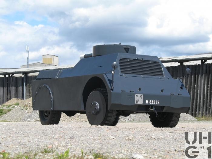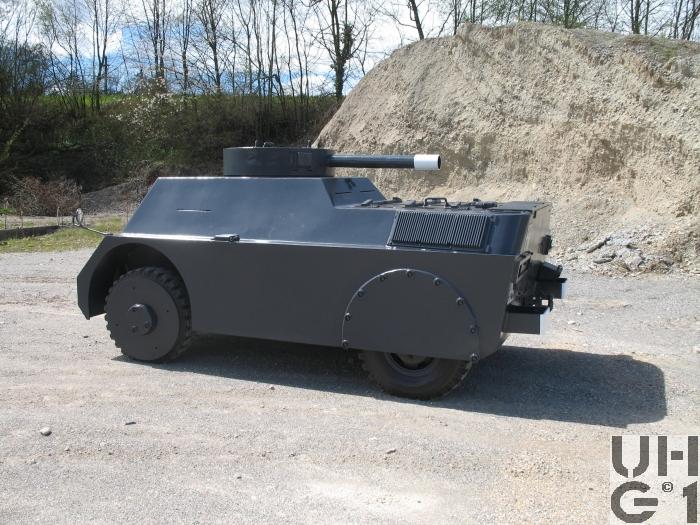 | Bemerkungen | Panzerung 10 mm + 60 mm Seitenwand, mit Holz und Gummiplatten 8 mm Vorderwand 8 mm Rückwand 8 mm Dach 8 mm Drehturm 6 mm Boden und Radkasten Das Fahrzeug ist auf dem Mowag 1t 4x4 aufgebaut M+Nummern M+83061 bis M+83299 |