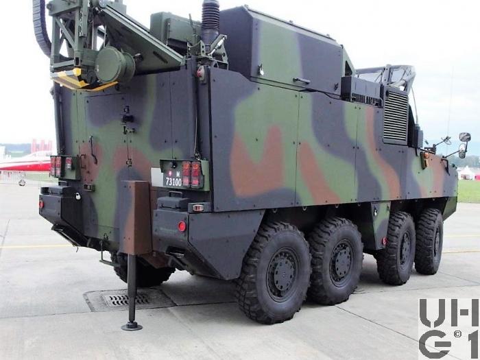 | Getriebe | 1 Hauptgetriebe Hersteller ZF Typ 7HP602 Gänge 7 Vorwärtsgänge 1 Rückwärtsgang Bauart Lastschalt Planetengetriebe mit hydraulisch betätigten Kupplungen Drehmomentwandler mit Überbrückungskupplung und Retarder 1 Verteilergetriebe Hersteller GDELS - Mowag Bauart Gerade verzahntes Stirnradgetriebe mit formschlüssiger Zahnradsperre Notlenkpumpenantrieb und reguliertem Kühlsystem 2 Ausgleichsgetriebe 1. + 2. Achse Hersteller GDELS - Mowag Konfiguration Selbstsperrdifferential mit Schaltzylinder Sperre 45% 2 Ausgleichsgetriebe 3. + 4. Achse Hersteller GDELS - Mowag Konfiguration Selbstsperrdifferential mit Arretierstange Sperre 45% 4 Radantriebe Hersteller GDELS - Mowag Konfiguration Planetengetriebe |