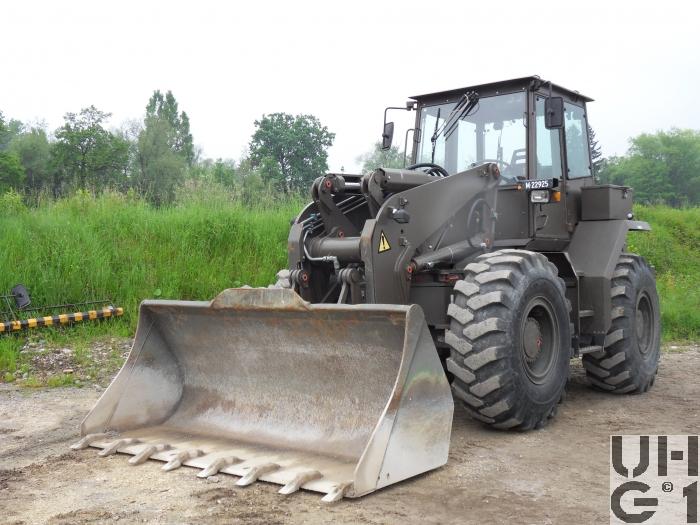 | Bemerkungen | Anbaugeräte Ladeschaufel 2m³ Frontbagger mit Tieflöffel Schwenklader Hydraulikhammer Krupp HM 350 V Hubgabel Hubarm mit Lasthaken Planiermesser Pistenräumer Fahrzeug kann umgebaut werden zum Pistenräumwagen für mechanisches Räumen von dynamisch oberflächenverlegten Minen |