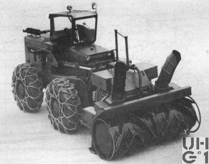 | Bemerkungen | Schneefräsaggregat Frästrommeldurchmesser: 1'000 mm Höhe inkl. Auspuffrohren: 2'650 mm Höhe mit umgelegten Rohren: 2'320 mm Räumbreite: 2'600 mm Wurfweite: 15'000 mm Räummenge: 4'000 m3/h Antriebsmotor Marke: Deutz Typ: A8L 614 Zylinder: 8 Zylinder V90° 4-Takt, Wirbelkammer Bohrung: 110 mm Hub: 140 mm Hubraum: 10'640 cm3 Leistung: 145 PS / 2'000 U/min Kühlung: Luft Batterien: 2 Batterien 12 Volt 125 Ah Spannung: 24 Volt Verbrauch: 10 Liter/h Treibstoff: Diesel Der Treibstoff wird dem Treibstofftank der Pneuladeschaufel über flexible Leitungen entnommen. Kraftübertragung Hauptkupplung: Fichtel und Sachs Typ LA-70 Bedienung: Elektropneumatisch oder von Hand Vertikalkettenantrieb: 6-facher Kettenantrieb Horizontalkettenantrieb: 1-facher Kettenantrieb Druckluftanlage Kompressor: Westinghouse Typ 35-P Antrieb: Keilriemen Betriebsdruck: 5-6 atü Druckluftreservoir: 30 Liter Zur Betätigung der Hauptkupplung ist Druckluft erforderlich. Fräswalzen Die Fräswalzen bestehen aus kräftigen Stahlblechtrommeln, auf denen 5 Frässchaufeln aufgeschweisst sind. An den Frässchaufeln sind auswechselbare Stahlschneiden angebracht. Als Sicherung ist an jeder Walze eine Rutschkupplung angebracht. Drehzahl: 300 U/min bei Motordrehzahl von 2'000 U/min Schneestrahl-Lenkvorrichtung Antrieb: 2 reversierbare 24 Volt Gleichstrommotoren mit Schneckengetriebe und Kettenübertragung. Die Auswurfkamine können mittels Elektromotoren gedreht werden. Die Bedienung der Lenkmotoren erfolgt vom Steuerpult aus. Die Fahrzeuge, welche für den Anbau des Schneefräsaggregates eingerichtet sind, erkennt man an den zwei Treibstoffanschluss-Stutzen an der Stirnwand. M+Nummern M+47610 M+47617 M+47621 Instruktionsfahrzeug in Brugg M+47622 M+47627 |