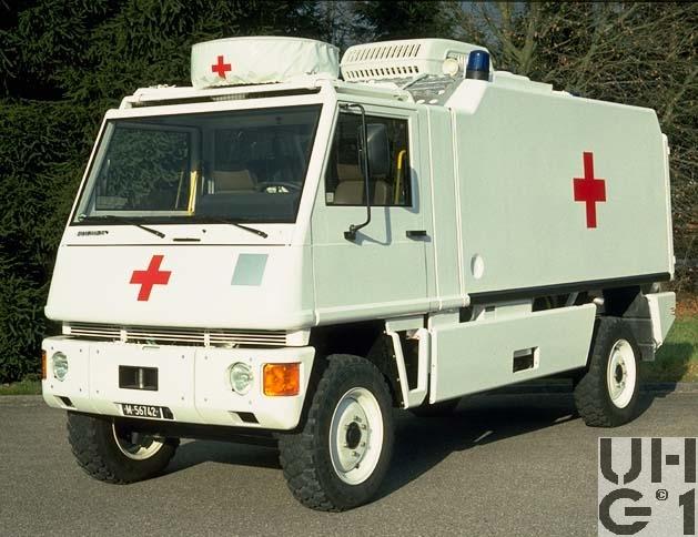 | Getriebe | Hauptgetriebe Hersteller Mercedes Benz Typ W 4 A 028 4 Gang Automat hydraulisch gesteuert 4 Vorwärtsgänge 1 Rückwärtsgang Übersetzung 1. Gang 3,871:1 2. Gang 2,247:1 3. Gang 1,436:1 4. Gang 1,000:1 R. Gang 5,586:1 Verteilergetriebe Hersteller Bucher Typ V-2GS-TD 15 Synchronisiertes 2- Stufen Verteilergetriebe mit Torsen Längsdifferential 1 Stufe Strassenstufe 1 Stufe Berg- / Geländestufe Übersetzung 0,71:1 Strassengang 1,42:1 Geländegang |