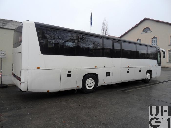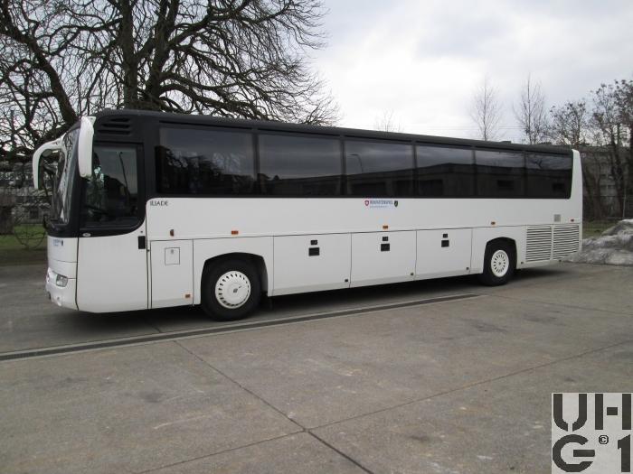| Achsen | Vorne Einzelradaufhängung Mc Pherson Federbein Voll-Luftfederung mit Niveauregulierung Unterstützt durch 2 Luftfederbälge 2 hydraulische Teleskop Stossdämpfer 1 Querstabilisator 2 Niveauregelventile Felgen Stahlscheibenrad 22,5 x 8,25 M 22 Bereifung Michelin X-Coach 295/80 R 22,5 152/148M Einfachbereifung Hinten Starrachse Einfach übersetzte Hypoidachse Luftfederung mit Niveauregulierung Unterstützt durch 4 Luftfederbälge Durchmesser 285 mm 4 hydraulische Zweiweg Teleskop Stossdämpfer 4 Hinterachsstreben 1 Querstabilisator 1 Niveauregelventil Fahrzeuganhebung vorne und hinten Felgen Stahlscheibenrad 22,5 x 8,25 M 22 Bereifung Michelin X-Coach 295/80 R 22,5 152/148M Doppelbereifung |