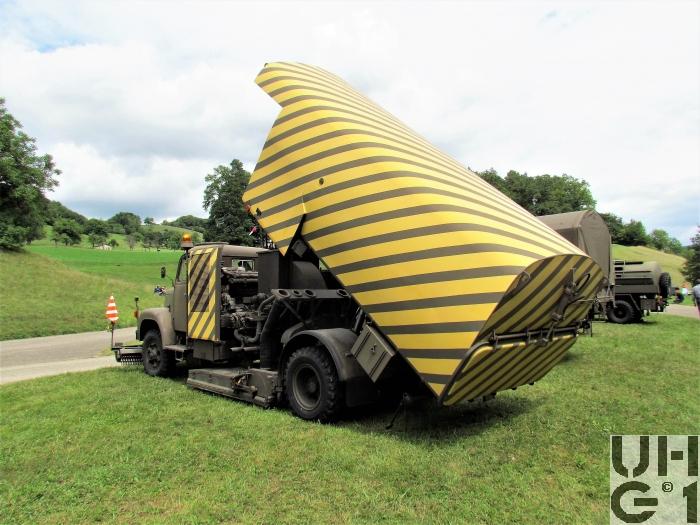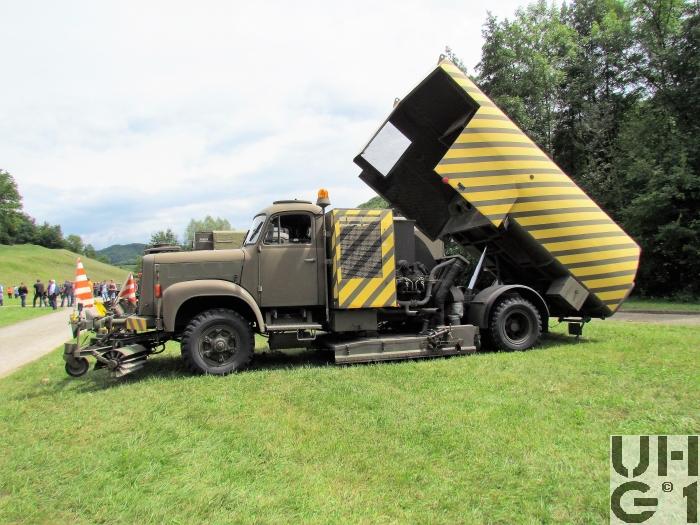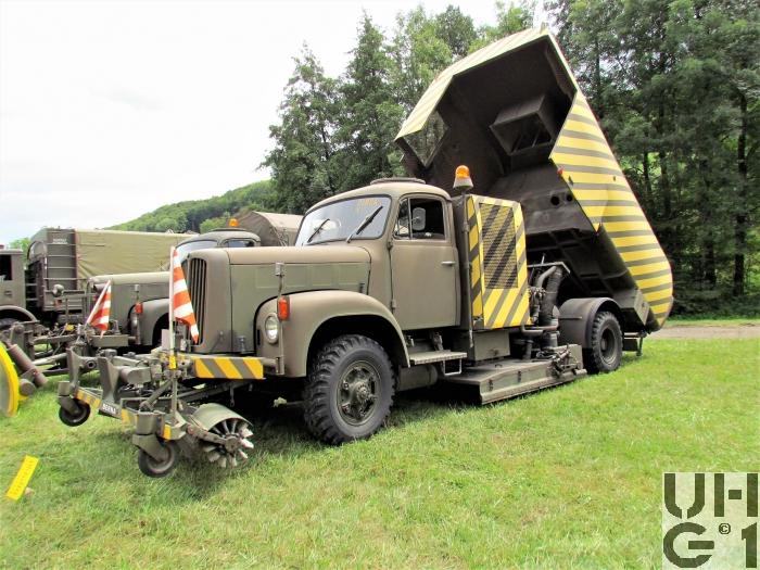 | Achsen | Vorne Starrachse Radantrieb über homokinetische Antriebsgelenke Halbelliptische Längsblattfedern, 12 Blatt Hydraulische Teleskopstossdämpfer Felgen 7.50 - 20 Trilex Stahlguss Felgen Bereifung Firestone Super All Traction 9.00 - 20, 12 Ply, 136/133 J Einfachbereifung Hinten Starrachse Antriebsachse mit Kegelraddifferential und doppelter Rücksetzung Übersetzung 6,14:1 Radantrieb über Differentialwellen Halbelliptische Längsblattfedern, 11 Blatt Hilfsfeder Differentialsperre, pneumatisch betätigt Felgen 7.50 - 20 Trilex Stahlguss Felgen Bereifung Firestone Super All Traction 9.00 - 20, 12 Ply ,136/133 J Doppelbereifung |