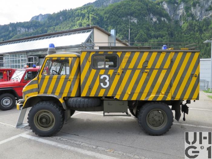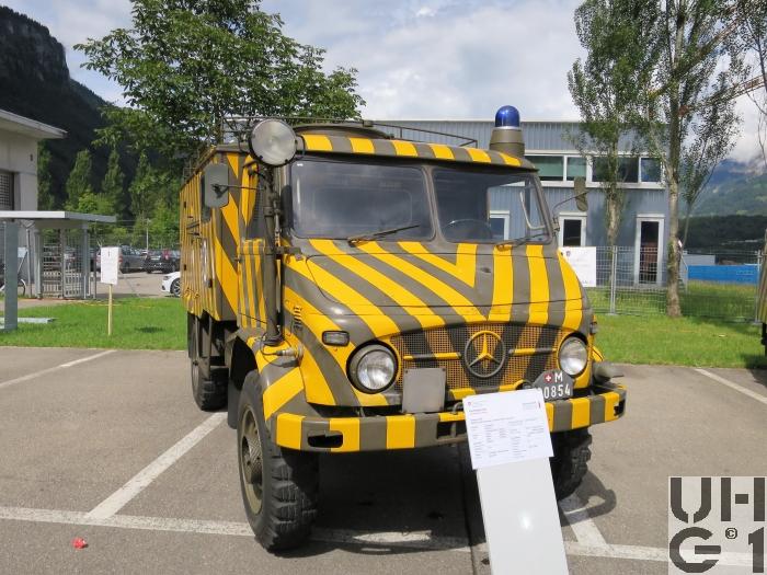 | Getriebe | Hauptgetriebe Hersteller Daimler Benz Typ UG 1 / 11 Mechanisches Zahnrad Wechselgetriebe Zwangsmässig synchronisiert 6 Vorwärtsgänge 2 Rückwärtsgänge 1. und 2. Gang für Gelände und schwere Zuglasten 3. bis 6. Gang für Normalbetrieb auf der Strasse Rückwärtsfahren nur im 1. und 2. Gang möglich Stockschaltung Separater Schalthebel für Rückwärtsgang Untersetzung 1. Gang 14,93:1 2. Gang 8,23:1 3. Gang 4,47:1 4. Gang 2,46:1 5. Gang 1,52:1 6. Gang 1,00:1 1. R-Gang 20,12:1 2. R-Gang 11,09:1 Verteilergetriebe Im Hauptgetriebe eingebaut Dient zum einschalten des Vorderradantriebes Bedienung der Schaltung Schalthebel Schwarz: Hauptgetriebe Schalthebel Weiss: Rückwärtsgang Schalthebel Grün: Vorderradantrieb und Differentialsperren |