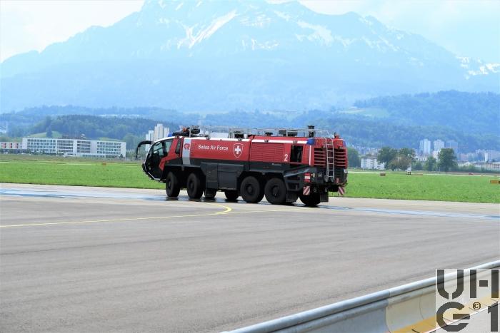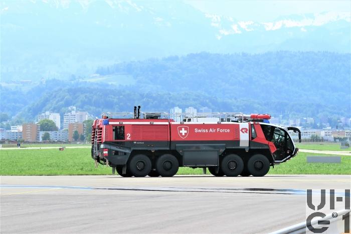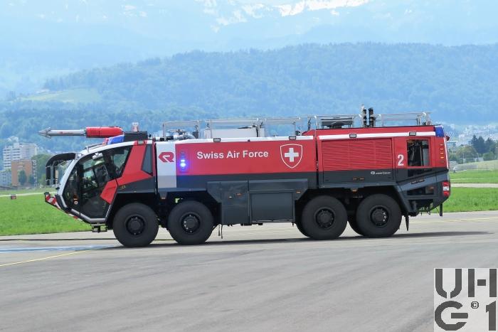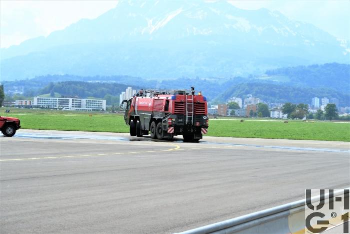 Bemerkungen | Aufbau Löschmittel: 14'000 Liter Wasser Schaummittel: 1'300 Liter Schaum CO2: 1x60 m bei 0,6 kg/Sec an der Fahrzeugfront, 4x50 kg Löschwasserpumpe: Rosenbauer N100 Pumpenleistung: 9'000 Liter/Minute bei 11 bar Dachwerfer: 7'000 Liter/Minute bei 10 bar, Wurfweite 85m Seitenleitungen: Links und rechts je 475 Liter/Min bei 7 bar, 50 m Bodensprühdüsen: (Selbstschutz) 7x ca. 75 Liter/Min Lichtmast: Höhe Lichtquelle ca. 5 m (LED) |