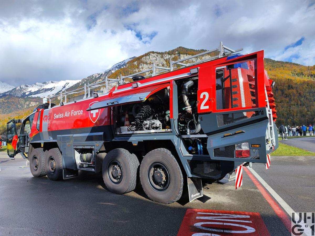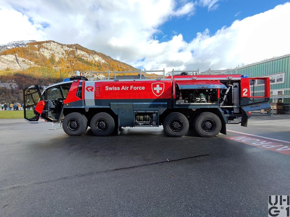 | Bemerkungen | Aufbau Löschmittel: 14'000 Liter Wasser Schaummittel: 1'300 Liter Schaum CO2: 1x60 m bei 0,6 kg/Sec an der Fahrzeugfront, 4x50 kg Löschwasserpumpe: Rosenbauer N100 Pumpenleistung: 9'000 Liter/Minute bei 11 bar Dachwerfer: 7'000 Liter/Minute bei 10 bar, Wurfweite 85m Seitenleitungen: Links und rechts je 475 Liter/Min bei 7 bar, 50 m Bodensprühdüsen: (Selbstschutz) 7x ca. 75 Liter/Min Lichtmast: Höhe Lichtquelle ca. 5 m (LED) |