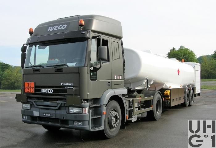 | Bemerkungen | M+Nummer M+45500 Lieferant Iveco Magirus AG, D-89079 Ulm Tanksattelanhänger Hersteller Atcomex Typ RS 29/18B/1C30 Mil Bezeichnung Tanksattel Anh Lfz Bet 30'000 l 2-achs Anzahl 1 Stück 11'870 mm Länge 2'500 mm Breite 3'050 mm Höhe 5'750/1'310 mm Radstand 30'000 Liter Tankvolumen 6'700 kg Leergewicht 23'150 kg Nutzlast 30'000 kg Gesamtgewicht 9'000 kg Max. Achslast Starrachsen, BPW SKH/SKM Luftfederung Scheibenbremsen Bereifung 385/65 R22,5 Tankaufbau für Treibstoffe, Betankungseinrichtung für das gleichzeitige Betanken von 2 Flugzeugen Abgabemenge bis 2x1'000 Liter/min |