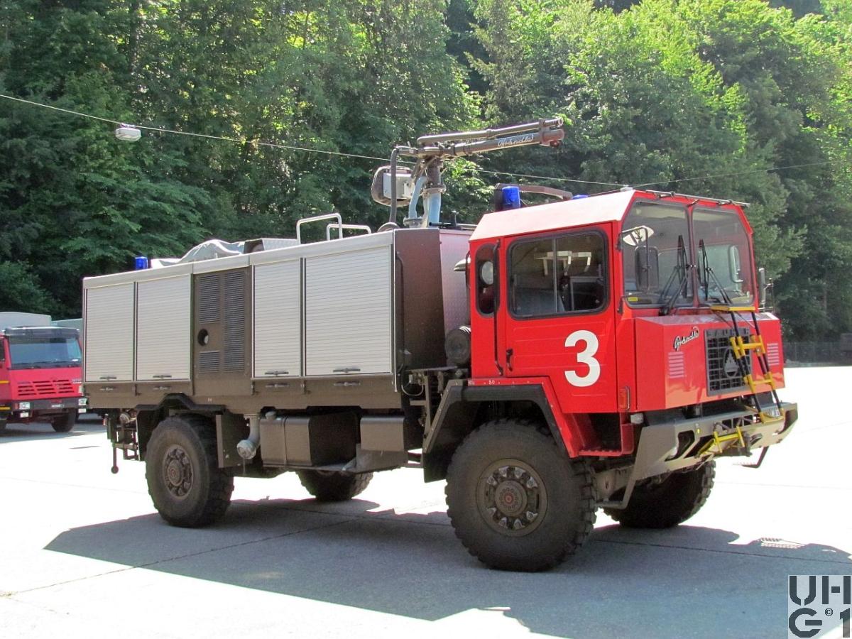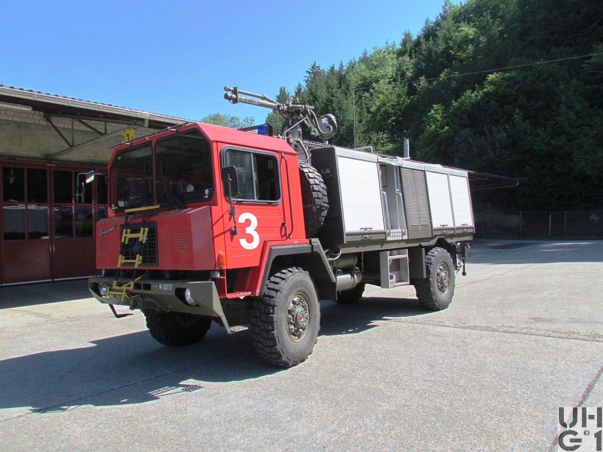 | Bemerkungen | Geschichte Die 21 Saurer 6 DM, die als Löschwagen Brändle vorgesehen waren, wurden zuerst 2 Jahre im Truppeneinsatz als Mannschafts- und Material Transporter eingefahren und erst dann als Löschwagen umgebaut und auf den Flugplätzen eingesetzt. Es erhielten nicht alle Fahrzeuge eine rote Kabine, teilweise sind auch Löschwagen mit der original grünen Kabine im Einsatz. Aufbauten und Monitore waren teilweise in Grün oder in Rot ausgeführt. Aufbau Hersteller Brändle Wil Typ GRD 011-00 Aufbaumotor Hersteller Mercedes Benz Typ OM 366 A 6 Zylinder Reihenmotor Viertakt Direkteinspritzung Abgasturbolader 5'958 ccm Hubraum 120 kW / 170 PS Leistung 560 Nm Drehmoment Wassertank 1'800 Liter Schaummittel 200 Liter Pulver 500 kg Löschwasserpumpe Hersteller Godiva Typ GVA 3 600 Schaumpumpe Hersteller Bornemann Typ E2H 236 Pumpenleistung 3'900 Liter pro Minute Monitor Typ HH 371S Wurfweite Monitor Wasser 35 - 50 m Wurfweite Monitor Schaum 10 - 40 m |