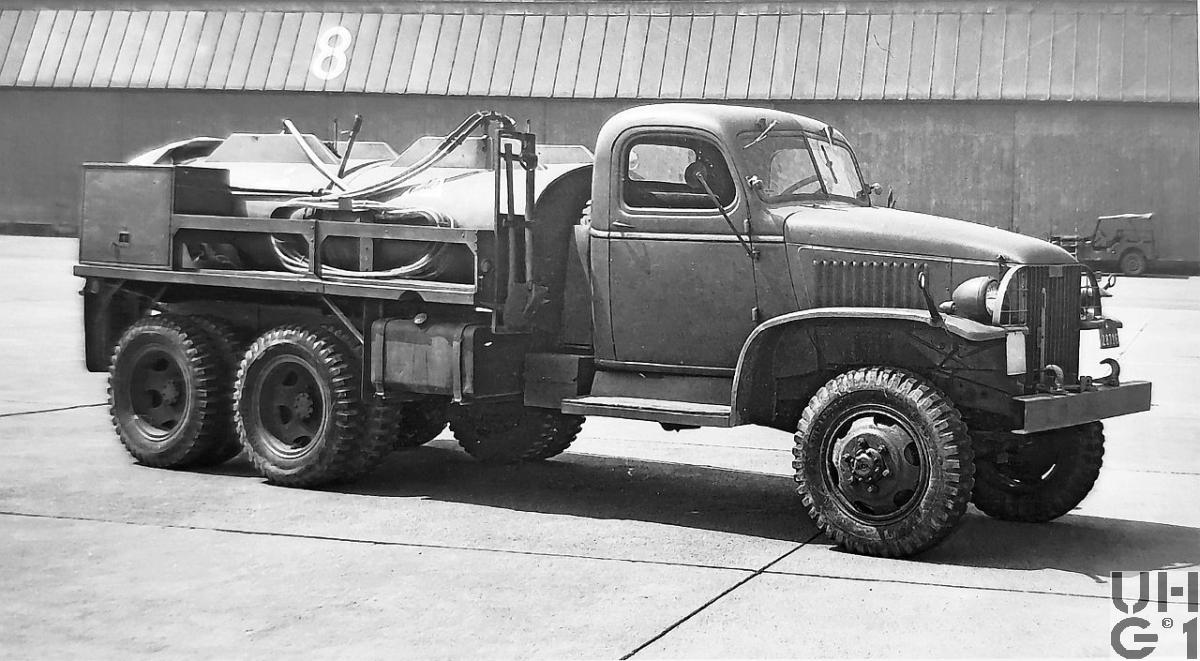 | Achsen | Vorne Hersteller GMC/Chevrolet Corporation Typ Banjo Starrachse Antriebsachse mit Hypoidantrieb und einfacher Rücksetzung Untersetzung 6,60:1 Radantrieb über homokinetische Antriebsgelenke Halbelliptische Längsblattfedern Hydraulische Hebelstossdämpfer Felgen Stahl Flachbettfelgen mit Sprengring Bereifung Firestone Ground Grip Type-ND 7.50 - 20, 8 Ply Einfachbereifung Hinten Hersteller GMC/Chevrolet Corporation Typ Banjo Starrachsen Antriebsachsen mit Hypoidantrieb und einfacher Rücksetzung Untersetzung 6,60:1 Radantrieb über Differentialwellen Halbelliptische Längsblattfedern, die je auf einem Privotzapfen drehbar gelagert und an jedem Ende auf eine der beiden Hinterachsen abgestützt sind Achsführung durch 4 gummigelagerte Torsionsstäbe unten und 2 gummigelagerte Torsionsstäbe oben Fegen Stahl Flachbettfelgen mit Sprengring Bereifung Firestone Ground Grip Type-ND 7.50 - 20, 8 Ply Doppelbereifung |