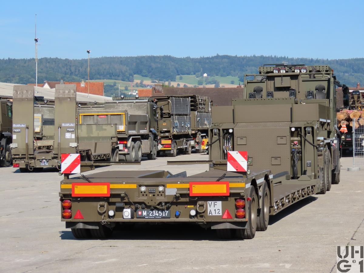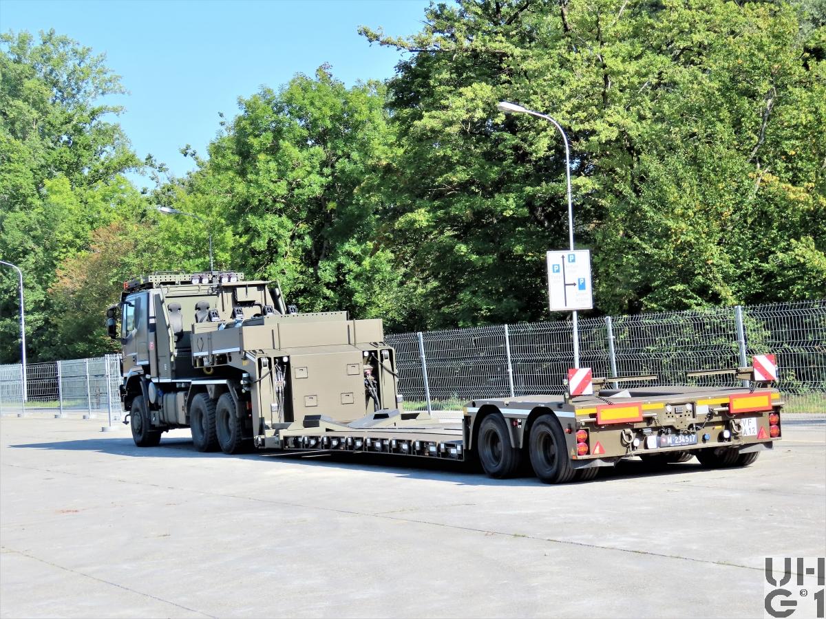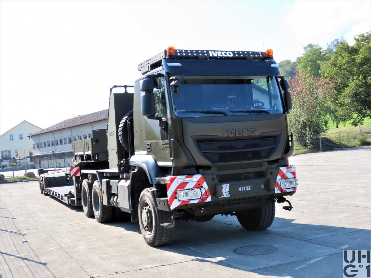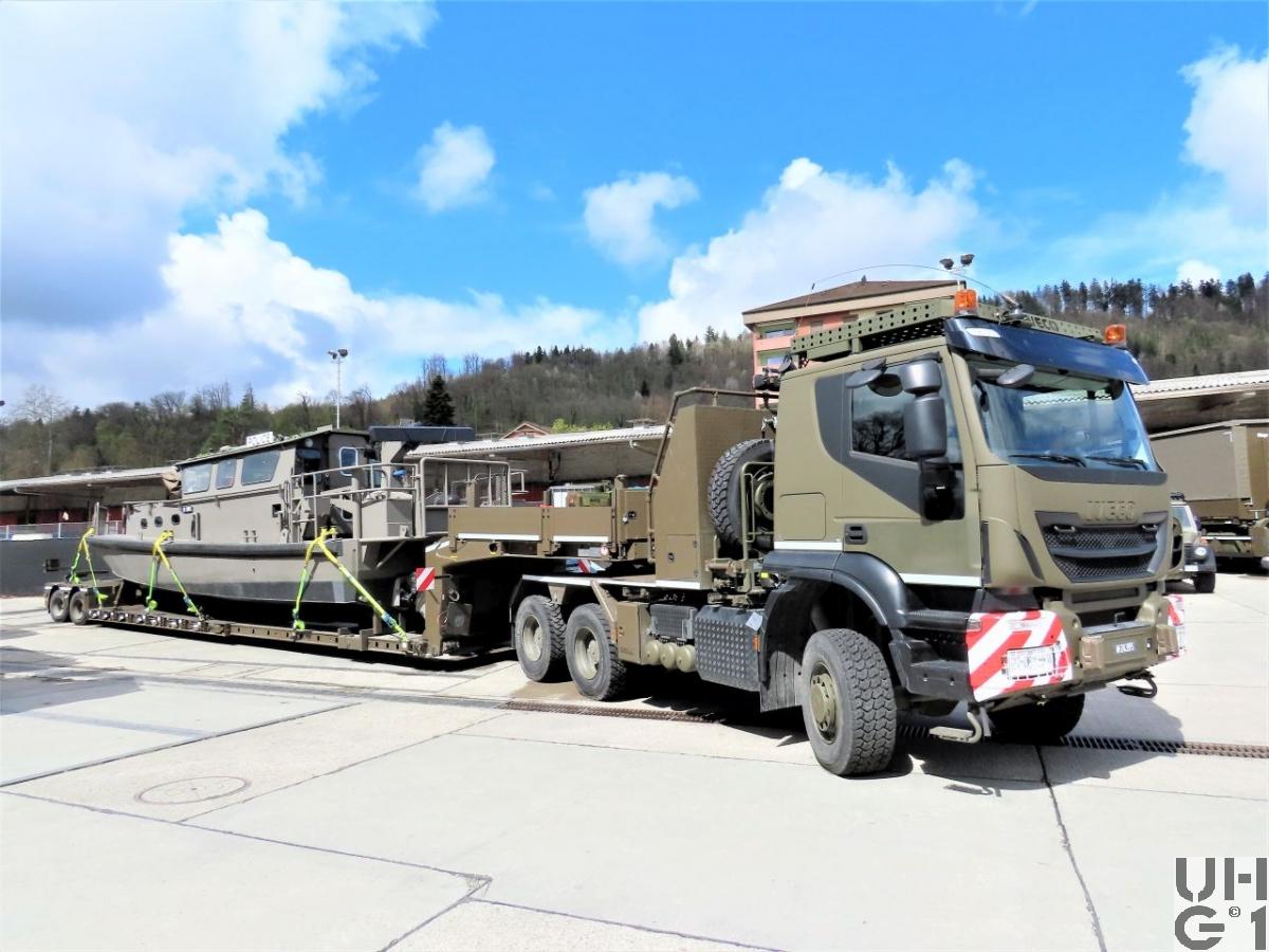 | Bemerkungen | Lieferanten Fahrgestell IVECO Magirus AG Aufbau Doll Fahrzeugbau Sattelanhänger 2-Achsig für Bootstransport 14'950 mm + 5'000 mm Länge 3'080 mm Höhe 1'500 mm Sattelkupplungshöhe 2'835 Breite 6'700 mm + 5'000 mm Länge Tiefbett 3'610 mm Nutzbare Höhe 390 mm Ladehöhe 2'750 mm Nutzbare Breite 16'500 kg Leergewicht 21'500 kg (27'500 kg ) Nutzlast 44'000 kg Gesamtgewichtsgarantie 38'000 kg (44'000 kg) Max. Betriebsgewicht 2x9'000 kg (12'000kg) Max. Achslast 20'000 kg Max. Sattellast Aufbau Sattel-Tiefbettanhänger ausziehbar, ausgerüstet für den Transport des Patrouillenbootes 16 Anzahl 10 Sattel-Tiefbettanhänger Beschaffung Über Rp 2016 |