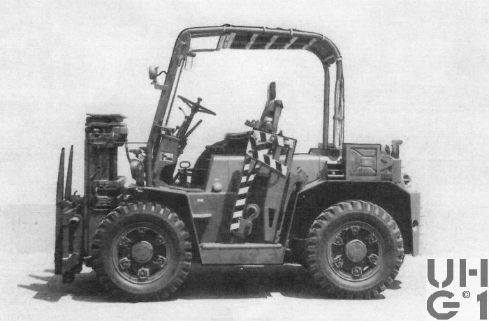 | Achsen | Vorderachse Hurth Axle, I-38062 Arco, Typ 172 Gerade, starre Triebachse mit Planetengetriebe in den Radnaben Lamellen Selbstsperrdifferential und nasslaufende Lamellenbremse Mit dem Verteilergetriebe verblockt Felgen 6.50 - 20 Trilex Stahlguss Felgen Bereifung 8.25 - 20, SAT, 12 PR Hinterachse Hurth Axle I-38062 Arco, Typ 272 Lenkachse Planetenlenktriebachse In der Mitte drehbare, gerade Triebachse mit Planetengetriebe in den Radnaben Lamellen Selbstsperrdifferential und Achsschenkellenkung Felgen 6.50 - 20 Trilex Stahlguss Felgen Bereifung 8.25 - 20, SAT, 12 PR |