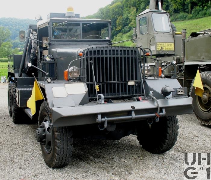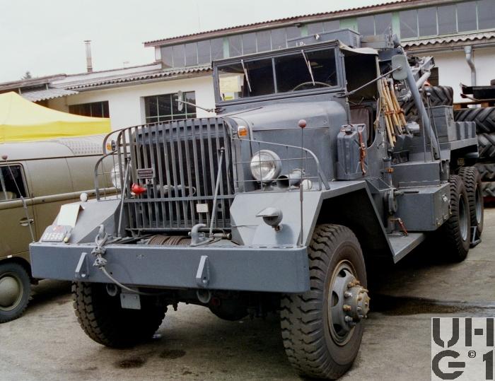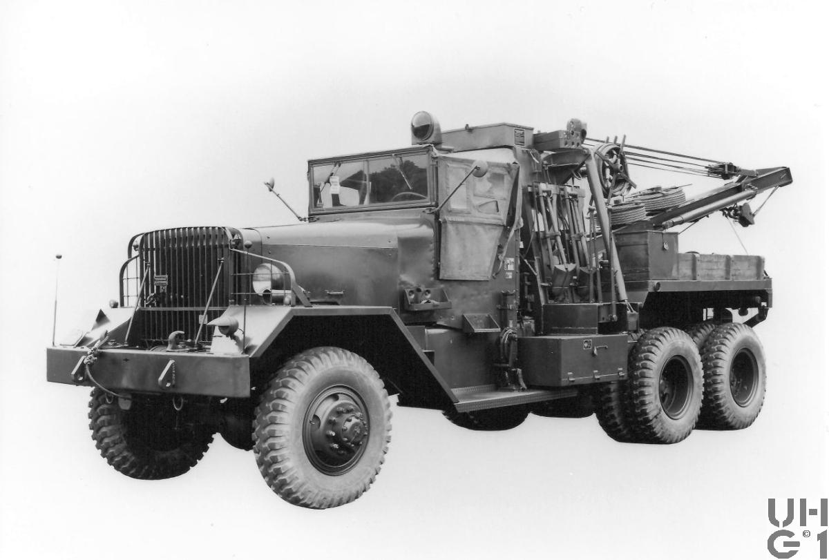 Achsen | Vorne Hersteller Timken Typ F-3200-W-X-3 Starrachse Antriebsachse mit Kegelraddifferential und doppelter Rücksetzung Übersetzung 8,27:1 Radantrieb über Homokinetische Antriebsgelenke Halbelliptische Längsblattfedern Hydraulische Hebelstossdämpfer Bereifung Armstrong Heatmaster 11.00 - 20 Military, 12 Ply Einfachbereifung Hinten 1. Achse Hersteller Timken Typ SD-3000-PA-X-5 Starrachse Antriebsachse mit Kegelraddifferential und doppelter Rücksetzung Übersetzung 8,27:1 Radantrieb über Differentialwelle 2. Achse Hersteller Timken Typ 75351-PA-X-5 Starrachse Antriebsachse mit Kegelraddifferential und doppelter Rücksetzung Übersetzung 8,27:1 Radantrieb über Differentialwelle 2 halbelliptische Längsblattfedern, die je auf einem Privotzapfen drehbar gelagert und an jedem Ende auf eine der beiden Hinterachsen abgestützt sind. Achsführung durch gummigelagerte Längslenker Bereifung Armstrong Heatmaster 11.00 - 20 Military, 12 Ply Doppelbereifung |