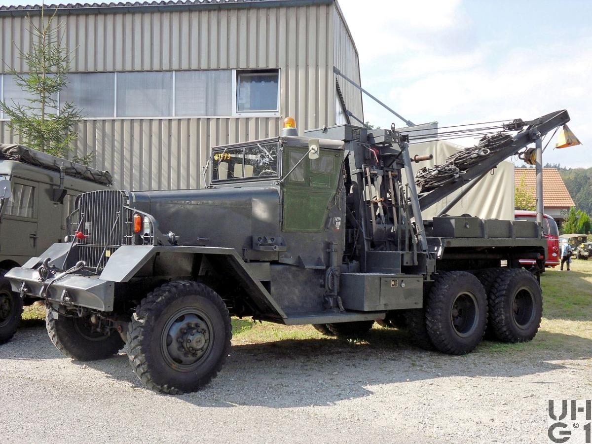 | Achsen | Vorne Hersteller Timken Typ F-3200-W-X-3 Starrachse Antriebsachse mit Kegelraddifferential und doppelter Rücksetzung Übersetzung 8,27:1 Radantrieb über Homokinetische Antriebsgelenke Halbelliptische Längsblattfedern Hydraulische Hebelstossdämpfer Felgen Stahlscheibenräder, durchbrochen, Flachbettfelgen mit Sprengring Bereifung Armstrong Heatmaster 11.00 - 20 Military, 12 Ply Einfachbereifung Hinten 1. Achse Hersteller Timken Typ SD-3000-PA-X-5 Starrachse Antriebsachse mit Kegelraddifferential und doppelter Rücksetzung Übersetzung 8,27:1 Radantrieb über Differentialwelle 2. Achse Hersteller Timken Typ 75351-PA-X-5 Starrachse Antriebsachse mit Kegelraddifferential und doppelter Rücksetzung Übersetzung 8,27:1 Radantrieb über Differentialwelle 2 halbelliptische Längsblattfedern, die je auf einem Privotzapfen drehbar gelagert und an jedem Ende auf eine der beiden Hinterachsen abgestützt sind. Achsführung durch gummigelagerte Längslenker Felgen Stahlscheibenräder, durchbrochen, Flachbettfelgen mit Sprengring Bereifung Armstrong Heatmaster 11.00 - 20 Military, 12 Ply Doppelbereifung |