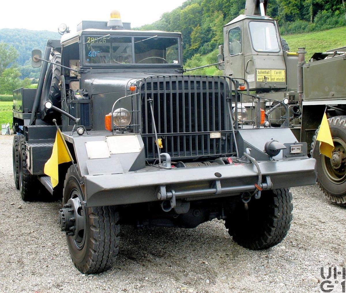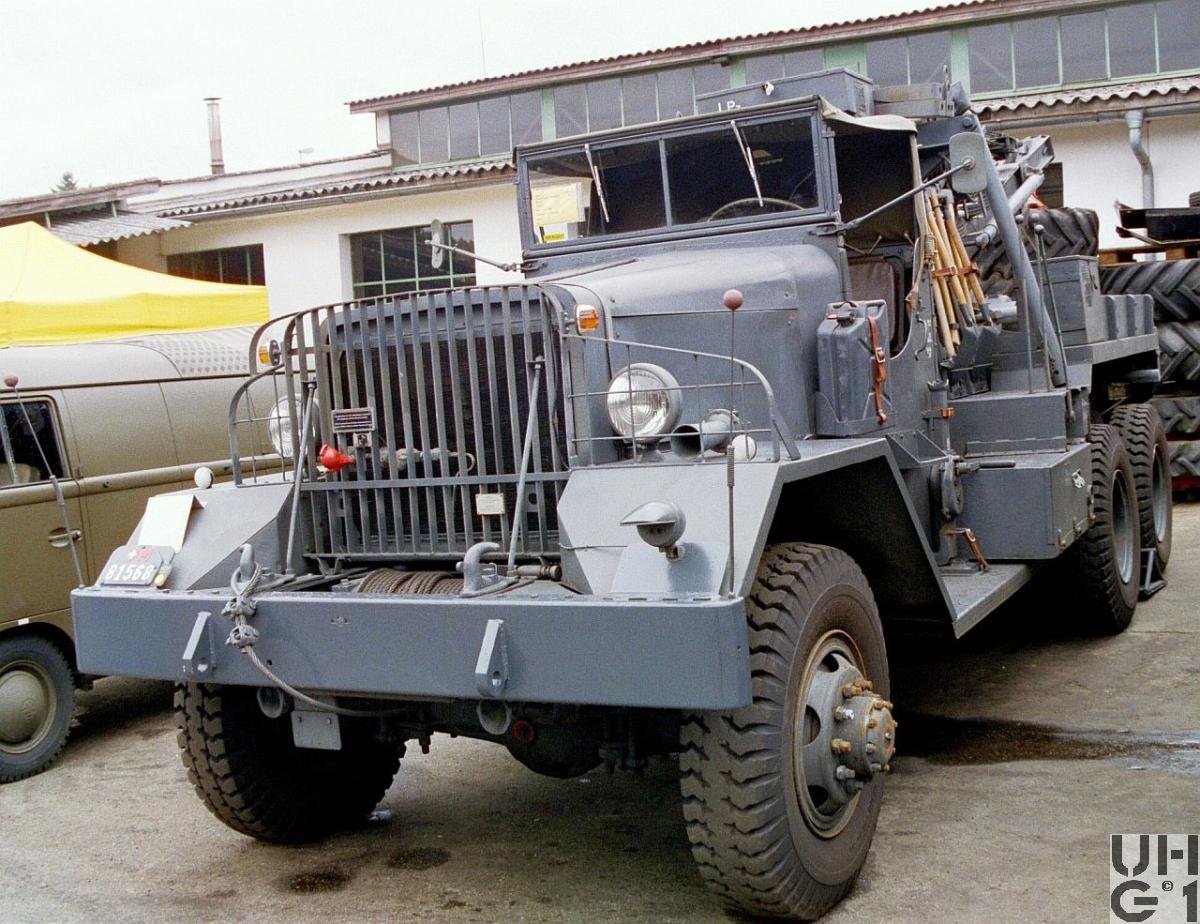 | Getriebe | Hauptgetriebe Hersteller Fuller Mechanisches Schubrad Wechselgetriebe 5 Vorwärtsgänge 1 Rückwärtsgang Stockschaltung Übersetzung 1. Gang 7,07:1 2. Gang 3,50:1 3. Gang 1,72:1 4. Gang 1,00:1 5. Gang 0,77:1 R. Gang 7,11:1 Verteilergetriebe Hersteller Timken Mechanisches Reduktions- und Verteilergetriebe mit 2 Schaltstufen für Strassen- und Geländegang Vorderradantrieb ausschaltbar Übersetzung 1,00:1 Strassengang 2,55:1 Geländegang Zapfwelle für Kran- und Seilwindenantrieb Bedienung der Schaltung Schalthebel Weiss Hauptgetriebe Schalthebel Rot Strassen- und Geländegang Schalthebel Grün Vorderradantrieb Schalthebel Blau Zapfwelle (Kran- und Seilwinde) |