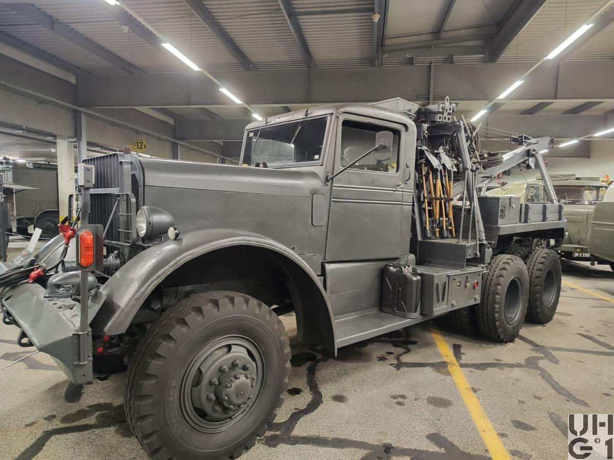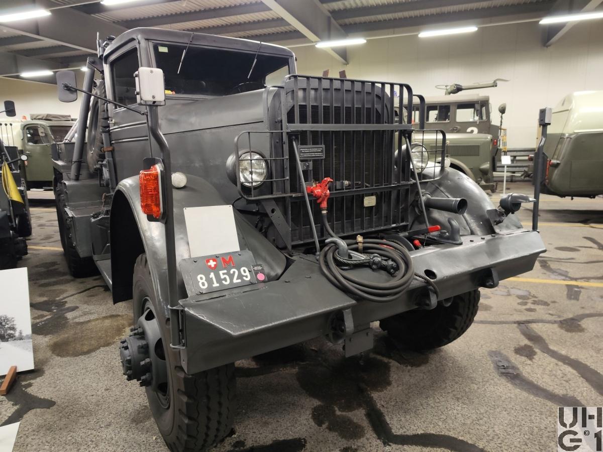 | Getriebe | Hauptgetriebe Hersteller Fuller Mechanisches Schubrad Wechselgetriebe 5 Vorwärtsgänge 1 Rückwärtsgang Stockschaltung Übersetzung 1. Gang 7,07:1 2. Gang 3,50:1 3. Gang 1,72:1 4. Gang 1,00:1 5. Gang 0,77:1 R. Gang 7,11:1 Verteilergetriebe Hersteller Timken Mechanisches Reduktions- und Verteilergetriebe mit 2 Schaltstufen für Strassen- und Geländegang Vorderradantrieb ausschaltbar Untersetzung 1,00:1 Strassengang 2,55:1 Geländegang Zapfwelle für Kran- und Seilwindenantrieb Bedienung der Schaltung Schalthebel Weiss Hauptgetriebe Schalthebel Rot Strassen- und Geländegang Schalthebel Grün Vorderradantrieb Schalthebel Blau Zapfwelle (Kran- und Seilwinde) |