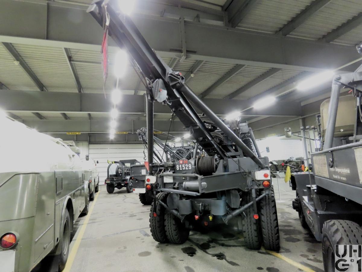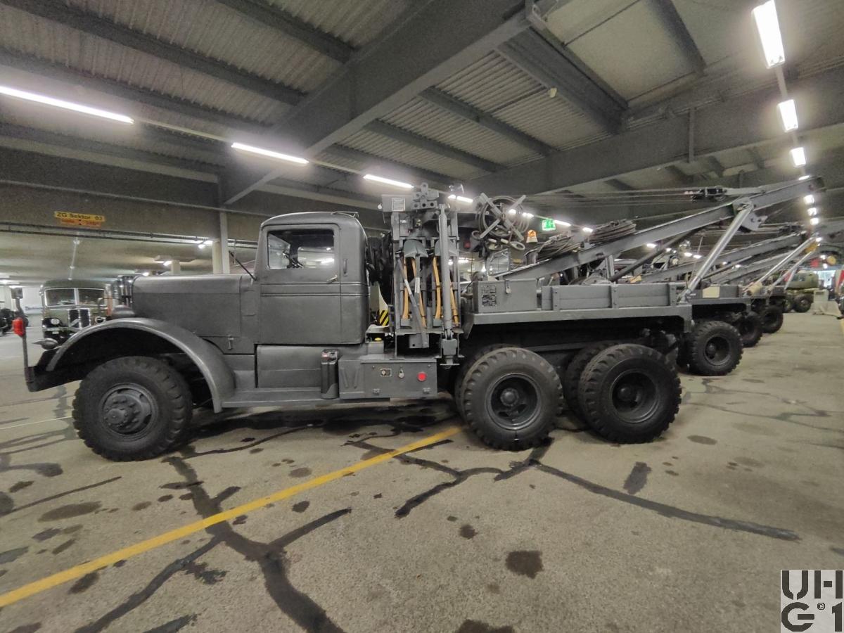 | Achsen | Vorne Hersteller Timken Typ F-3200-W-X-3 Starrachse Antriebsachse mit Kegelraddifferential und doppelter Rücksetzung Übersetzung 8,27:1 Radantrieb über Homokinetische Antriebsgelenke Halbelliptische Längsblattfedern Hydraulische Hebelstossdämpfer Felgen Stahlscheibenräder, durchbrochen, Flachbettfelgen mit Sprengring Bereifung Armstrong Heatmaster 11.00 - 20 Military, 12 Ply Einfachbereifung Hinten 1. Achse Hersteller Timken Typ SD-3000-PA-X-5 Starrachse Antriebsachse mit Kegelraddifferential und doppelter Rücksetzung Übersetzung 8,27:1 Radantrieb über Differentialwelle 2. Achse Hersteller Timken Typ 75351-PA-X-5 Starrachse Antriebsachse mit Kegelraddifferential und doppelter Rücksetzung Übersetzung 8,27:1 Radantrieb über Differentialwelle 2 halbelliptische Längsblattfedern, die je auf einem Privotzapfen drehbar gelagert und an jedem Ende auf eine der beiden Hinterachsen abgestützt sind. Achsführung durch gummigelagerte Längslenker Felgen Stahlscheibenräder, durchbrochen, Flachbettfelgen mit Sprengring Bereifung Armstrong Heatmaster 11.00 - 20 Military, 12 Ply Doppelbereifung |