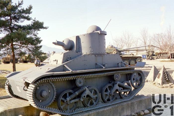| Bemerkungen | Geschichte In der Schweiz waren zwei verschiedene Typen im Einsatz. 1934 wurde ein Vickers Carden Loyd Tank Modell 1933 mit Blattfedern gekauft, ebenso ein Vickers Carden Loyd Tank Modell 1934 mit Spiralfedern. 1935 werden dann noch vier Vickers Carden Loyd Modell 1934 gekauft. Die Fahrzeuge wurden vorab für Truppenversuche gebraucht. 1948 wurden sie ausgemustert. Einteilung Pzw Kp 1 Pzw Kp 2 Später Mot HP Bat 1 |