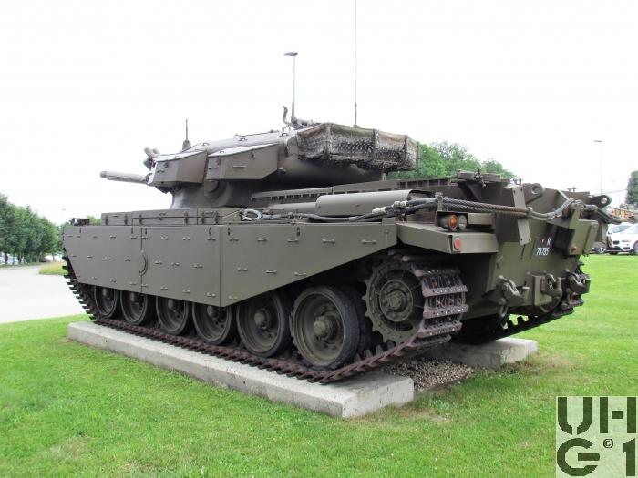 | Hauptwaffe | 10,5 cm Panzer Kanone 1960 10,5 cm Pz Kan 60, stabilisiert Hersteller Royal Ordnance Factories England Entwickler Royal Ordnance Factories England Technische Daten 105 mm Kaliber 360° 6'400 A‰ Seitenrichtbereich 1 Umdrehung an der Seitenrichthandkurbel 9 A‰ - 10° bis + 20° - 180 A‰ bis + 350 A‰ Höhenrichtbereich 1 Umdrehung am Höhenrichthandrad 19 A‰ 88,6 cm² Querschnitt inkl. Züge 5'590 mm Länge über Bodenstück 5'345 mm Länge von Hülsenanschlag bis Rohrmündung 4'713 mm Länge des gezogenen Teils 1'890 mm Drallänge 28 Züge Konstanter Rechtsdrall 292 mm Rücklauflänge 2'823 kg Geschütz 1'357 kg Rücklaufendes Gewicht 1'227 kg Wiege 813 kg Geschützrohr mit Entlüfter und Führungen 760 kg Geschützrohr ohne Anbauten 510 kg Bodenstück mit Verschluss 147 kg 2 Rücklaufbremsen mit Vorholfedern 10 - 15 Schuss / Minute Feuergeschwindigkeit Einzelschuss Rohrrücklaufgeschütz Monobloc-Rohr mit Rohrentlüfter und aufgeschraubtem Bodenstück, ohne Mündungsbremse Halbautomatischer Horizontalkeilverschluss Schussauslösung elektrisch durch Richter am Höhenrichtrad oder Höhenkontroller Schussauslösung elektrisch mit Notabfeuerungsgerät durch Richter oder Kommandant Das Geschütz wird von Hand geladen Der Hülsenauswurf erfolgt automatisch Geschützbewegung von Hand, elektrisch und mit stabilisiertem Betrieb Zielvorrichtung für Hauptbetrieb über Zielgerät Richter, Zielgerät Kommandant, Richtaufsatz, Feldvisier, Seitenrichtuhr Zielvorrichtung für Notbetrieb über Aufsatzquadrat zum Richtaufsatz, Höhenrichtrad am Richterposten Kampfmunition St G MZ 54 Lsp, 600 m/s, Gewicht 19,9 kg RBr G MZ 54 Lsp, 600 m/s, Gewicht 19,9 kg Pz Ke G Lsp L 28, 1'470 m/s (APDS), Gewicht 18,2 kg Pz Ke G Lsp L 52, 1'418 m/s (APDS), Gewicht 18,2 kg Pz Spr G BoZ Lsp, 728 m/s (HESH), Gewicht 21,0 kg Pfeil Pat Lsp, 1'448 m/s (APFSDS-T), Gewicht 18,7 kg Pfeil Pat 87 Lsp, 1'448 m/s (APFSDS-T), Gewicht 18,7 kg Übungmunition EUG MZ 54 Lsp, 602 m/s, Gewicht 19,9 kg U Pz Ke G Lsp, 1'314 m/s, Gewicht 18,2 kg Manipuliermunition Manip Pz Spr G, Gewicht 21,0 kg Manip St G, Gewicht 20,4 kg Manip RBr G, Gewicht 19,9 kg Manip Pfeil Pat, Gewicht 18,7 kg Manip Pz Ke G, Gewicht 18,2 kg Markiermunition Mark G, Gewicht 5,8 kg 24 mm Einsatzlauf zur 10,5 cm Pz Kan 60/61 Munition EUG 55 elektr Zü VZ Lsp, 900 m/s, Gewicht 225 gr U Pat 90 Lsp, 1'180 m/s, 255 gr |