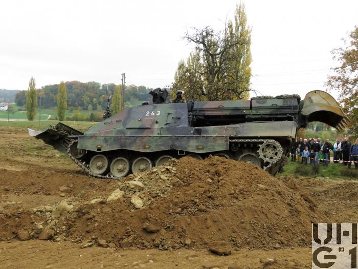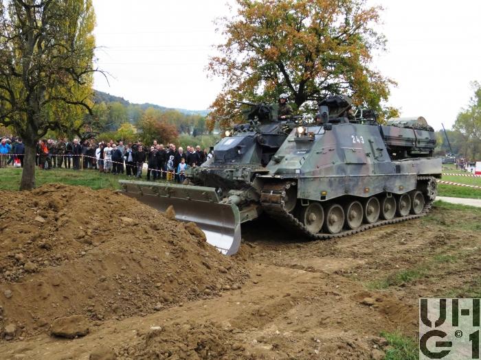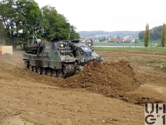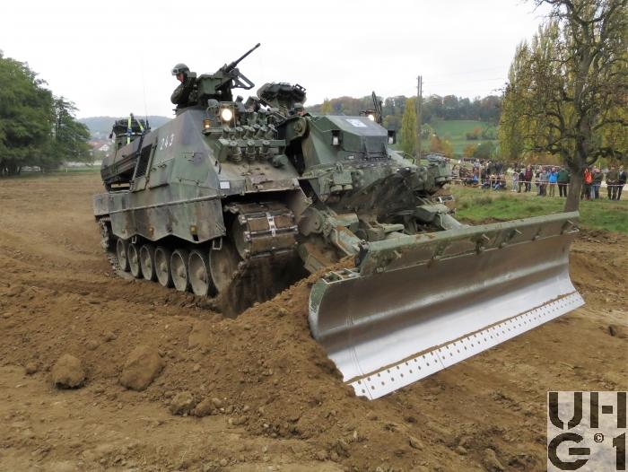 | Bemerkungen | Einteilung Pz Sap Bat 1 Pz Sap Bat 11 Dozeranlage Die Dozeranlage ist als Anbaugerät konzipiert, sie wird vom Fahrzeug mit elektrischer und hydraulischer Energie versorgt. Technische Daten Dozerblatt 3'420 mm Breite ohne Verbreiterungrn 4'020 mm Breite mit Verbreiterungen 1'100 mm Höhe 300 mm Reisstiefe 400 mm Räumtiefe 350 m³ / h Räumleistung Der Geniepanzer wird hauptsächlich im Bereich der Erdbewegung eingesetzt Gräben und Löcher zuschütten Panzerstellungen ausstossen Planierarbeiten Räumen von Hindernissen und Trümmern Furten erstellen Baggeranlage Die Baggerkonsole ist mittig am Wannenbug fest aufgebaut. In der Ruheposition wird der Baggerarm zwischen dem linken und dem rechten Mannschaftsraum auf dem Wannenheck abgelegt. Technische Daten Baggerbetrieb 9'000 mm Reichweite 4'000 mm Grabtiefe 9'200 mm Arbeitshöhe 1.00 m³ Löffelinhalt 85 kN Reisskraft Stiel einfahren 120 kN Losbrechkraft Löffel einkippen 200 m³ / h Grableistung Technische Daten Kranbetrieb 2'600 kg mit Tieflöffel Traglast mit horizontal gestrecktem Baggerarm 3'300 kg ohne Tieflöffel Windenanlage Der Geniepanzer verfügt über 2 Seilwinden. Die Winden sind im Wannenbug vor dem Fahrerplatz und dem Kommandantenplatz eingebaut. Die Seilwinden können einzel oder parallel genutzt werden. Der Geniepanzer wird beim Windenbetrieb mit dem Dozerblatt im Boden verankert. Die Windenanlage wird primär zum Ziehen von Lasten, zur Selbstbergung und sekundär zum Bergen von Fahrzeugen eingesetzt. Technische Daten Windenbetrieb 90 kN Zugkraft Einfachzug 170 kN Zugkraft Zweifachzug 240 kN Zugkraft Dreifachzug 310 kN Zugkraft Vierfachzug 16 mm Seildurchmesser 200 m Seillänge Nutzbar 6 m/min Seilgeschwindigkeit bei Last 90 kN 90 m/min Seilgeschwindigkeit bei 2,5 kN Noch mehr Details zum Fahrzeug finden Sie im Buch Die Panzer der Schweizer Armee seit 1921 https://militaerfahrzeuge.ch/produkt_13.html |