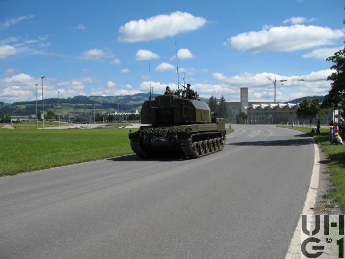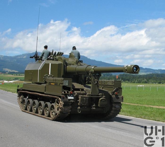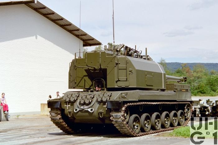 | Hauptwaffe | 15,5 cm Panzer-Artillerie Kanone 68 L46 15,5 cm Pz Art Kan 68 Hersteller Eidgenössische Konstruktionswerkstätte Thun Technische Daten 155 mm Kaliber 360° Seitenrichtbereich - 3° bis + 70° Höhenrichtbereich 6 Schuss / Minute Feuergeschwindigkeit 4'085 kg Gewicht rücklaufender Teil 7'300 kg Gewicht elevierender Teil 8'900 mm Gesamtlänge mit Ladevorrichtung 7'130 mm Rohrlänge 6'037 mm Drallänge 48 Züge Artilleriegeschütz zum Verschiessen von drallstabilisierter Munition Geschützwiege im Turm um 360° drehbar Steuerung von Turm und Geschütz erfolgt hydraulisch Schussauslösung erfolgt elektrisch Horizontal Keilverschluss Hydraulisch betätigt Automatische Ladevorrichtung Progressiever Rechtsdrall Patronenzufuhr einzel mit Ladevorrichtung 30 km Geschützreichweite Rundblickfernrohr, Direktzielfernrohr Munition Stahlgranaten Rauch-Brandgranaten Beleuchtungsgeschosse Zünder MVZ 67 MZZ 68 Ladungen Ladung 1 - 5, Gewicht 5,2 kg Ladung 6 - 8, Gewicht 16 kg |