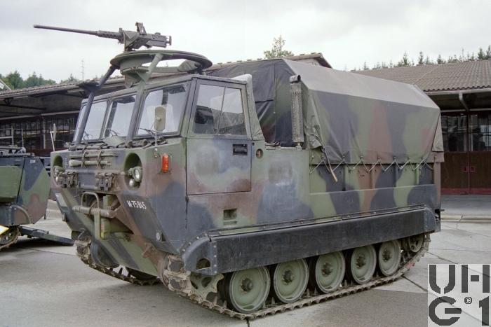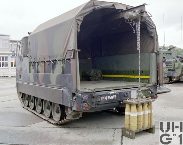 | Bemerkungen | Änderungen gegenüber Raupentransportwagen 68 5 t Fleckentarnanstrich Bessere Dieselheizung Verbessertes Fahrwerk Für den Umschlag der Artilleriemunition sind alle Fahrzeuge mit einem elektrischen Flaschenzug versehen. 400 kg Max. Hublast Inhalt der Ladebrücke 10 Paletten à 8 Granaten 15,5 cm 20 Gebinde à 4 Ladungen Fahrerraumheizung Hersteller Stewart - Warner Typ 10560 - C 24 Betriebsspannung 20 bis 28,5 Volt Gleichstrom Heizleistung Vollast 15'000 kcal/h Heizleistung Teillast 7'500 kcal/h Gewicht 15 kg Brennstoff Diesel Seilwinde Einbauort Vorne Hersteller Gar Wood Typ DAV 615-19207 9'000 kg Max Zugkraft 90 m Seillänge 55 m Seillänge nutzbar 15,87 mm Seildurchmesser |