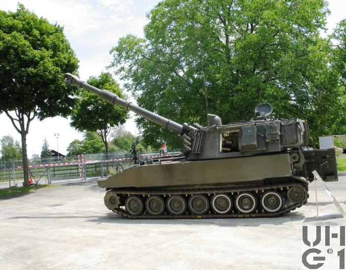 | Hauptwaffe | 15,5 cm Panzerhaubitze 1974 L-39 15,5 cm Pz Hb 74 Hersteller Watervliet Arsenal, Watervliet, New York, USA Technische Daten 155 mm Kaliber 6'997 mm Gesamtlänge 6'045 mm Rohrlänge 5'034 mm Gezogener Teil 5'048 mm Drallänge 48 Züge Konstanter Rechtsdrall - 3° bis + 54° Höhenrichtbereich 360° Seitenrichtbereich 2'930 kg Geschütz 1'950 kg Rücklaufende Teile 1'360 kg Geschützrohr ohne Bodenstück 180 kg Bodenstück mit Ring 160 kg Mündungsbremse 130 kg Verschluss 60 kg Bodenstückring 50 kg Rauchabsauger Halbautomatischer Schraubverschluss mit Stahlringdichtung und mechanischer Schussauslösung Rücklaufbremsen hydraulisch Vorholer pneumatisch Vorlaufdämpfer hydro-mechanisch Ladevorrichtung elektro-hydraulisch 6 Schuss pro Minute Schusskadenz 18 km Schussweite Stahlgranate, EUG 18 km Schussweite Kanistergeschoss 88 22 km Schussweite Kanistergeschoss 90 Kampfmunition 15,5 cm Hb St G oZ, Gewicht 42,1 kg 15,5 cm Hb R Br G oZ, Gewicht 43,3 kg, im Einsatz bis 1995 15,5 cm Hb Bel G oZ, Gewicht 44,3 kg 15,5 cm Hb Ka G 88 oZ, Gewicht 46,3 kg, Einsatz 1988 bis 2012 15,5 cm Hb Ka G 88/99 oZ, Einsatz 1999 bis 2012 15,5 cm Hb Ka G 90 oZ, Gewicht 41,6 kg, Einsatz 1990 bis 2012 Übungsmunition 15,5 cm Hb 74 EUG oZ, Gewicht 42,1 kg Manipuliermunition 15,5 cm Hb 66 Manip G 68 oZ 15,5 cm Hb 66 Trsp Manip G oZ Kampfladungen 15,5 cm Hb 66 Ladungen 3-7 (US) 15,5 cm Pz Hb 66 und 74 Ladg 3-7 (CH) 15,5 cm Pz Hb 74 Cont Ladg 3-7 (Einsatzreserve) 15,5 cm Pz Hb 74 Zu Ladg 8 (CH) 15,5 cm Pz Hb 74 Kan Ladg 7-9 Pz Hb 74 Kan Cont Ladg 7-9 Übungsladungen 15,5 cm Hb 74 ULadg 2 Manipulierladungen 15,5 cm Hb 66 Manip Ladg 3-7 (US) 15,5 cm Hb 66 und 74 Manip Ladg 3-7 (CH) 15,5 cm Pz Hb 74 Manip Zu Ladg 8 (CH) Zünder MVZ 67 MZZ 68 ZZ 565 ZZ 80 MZZ 88 AMZ 91 ZZ 99 ZZ 01 Manipulierzünder Manip MVZ 67 Manip MZZ 68 Manip ZZ 565 Manip ZZ 80 Zündpatronen 15,5 cm Hb 66 Zü Pat Manipulierzündpatronen 15,5 cm Hb 66 Manip Zü Pat |